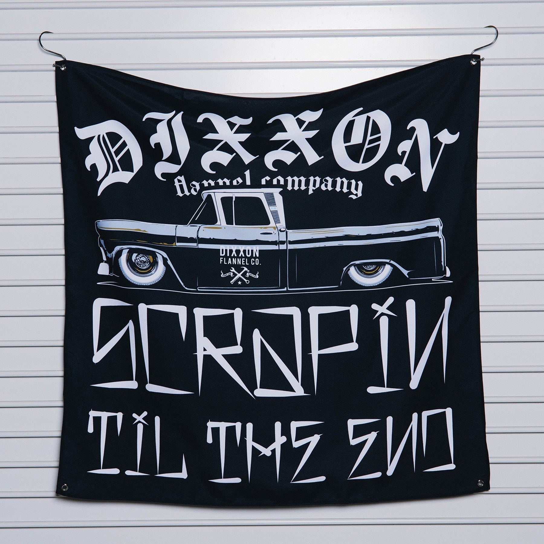 • White and black "SCRAPIN' TIL THE END" lowrider graphic