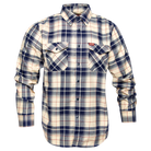 • Men's blue, white, and red plaid patterned flannel shirt