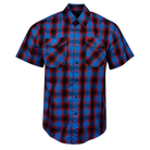 • Men's blue, red, and black plaid patterned short sleeve bamboo shirt