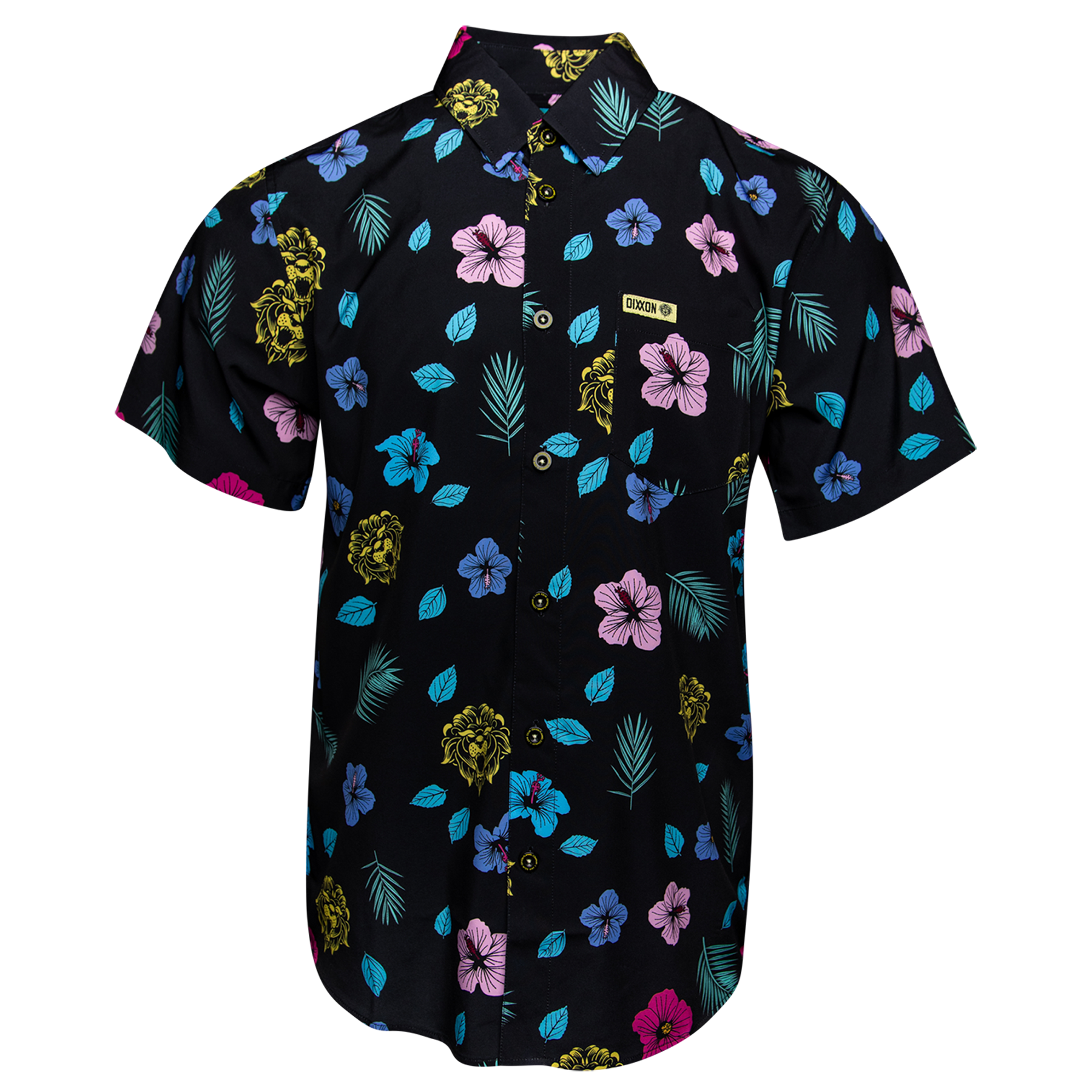 Add some metalcore mayhem to an everyday essential with the Miss May I Party Shirt. Designed in collaboration with the legendary Ohio heavyweights, this black short sleeve features a fierce allover print of pink and blue hibiscus flowers, wild foliage, and roaring lions for a shirt that *absolutely rips*. Finished with our signature party blend material, it's made to go hard‚ on stage or off.