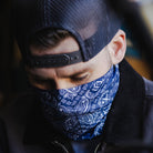 • Navy blue gaiter with white Dixxon bandana inspired print throughout