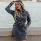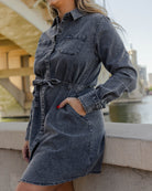 Modern structure meets lived-in edge with the Black Washed Denim Dress. Made from soft black denim with a vintage wash, this utility-inspired silhouette features a button-up front, chest patch pockets, and a removable self-tie belt to cinch it your way. Designed to transition from day to night, this wardrobe staple delivers effortless cool with just the right amount of polish.