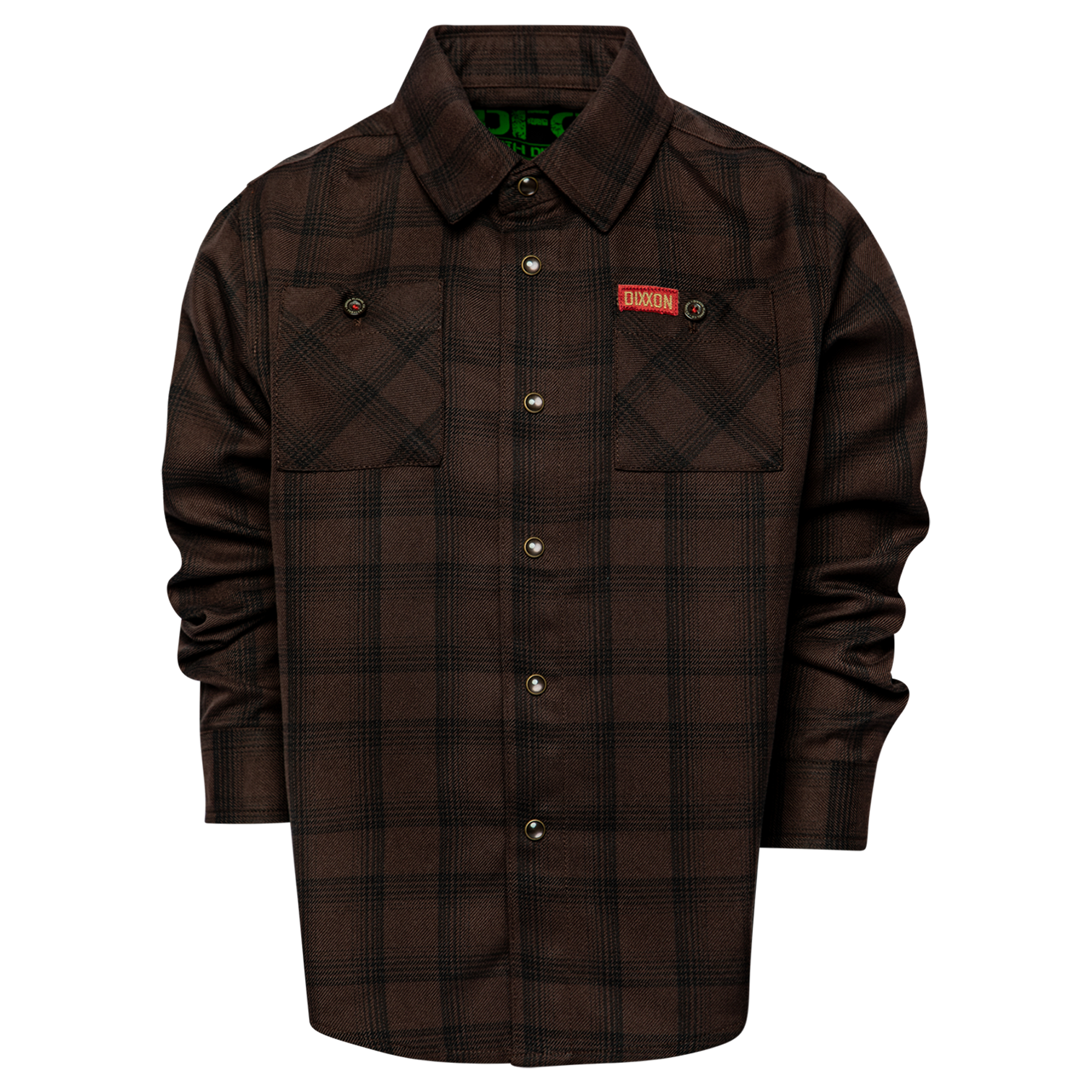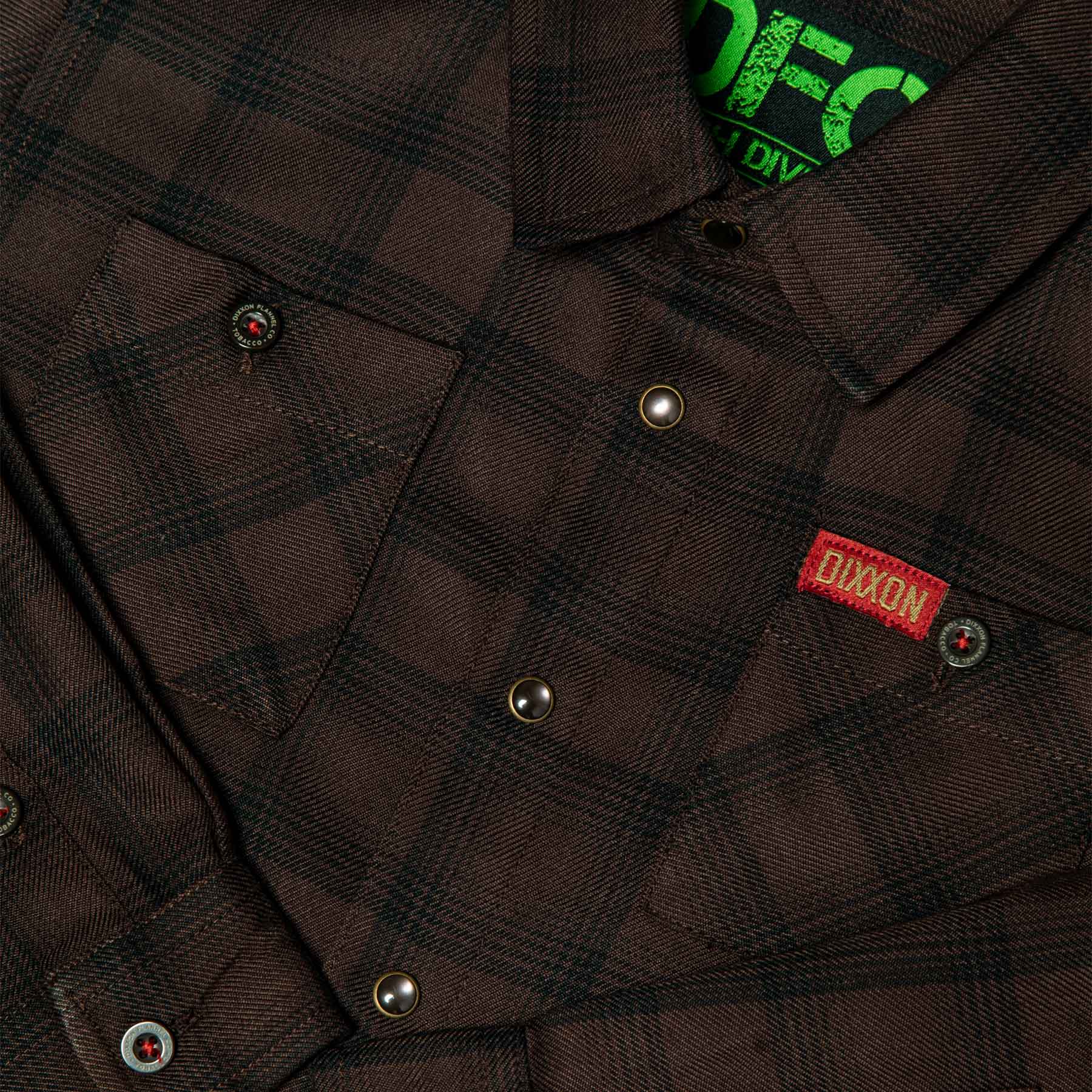 • Red Dixxon brand tag on the left chest pocket