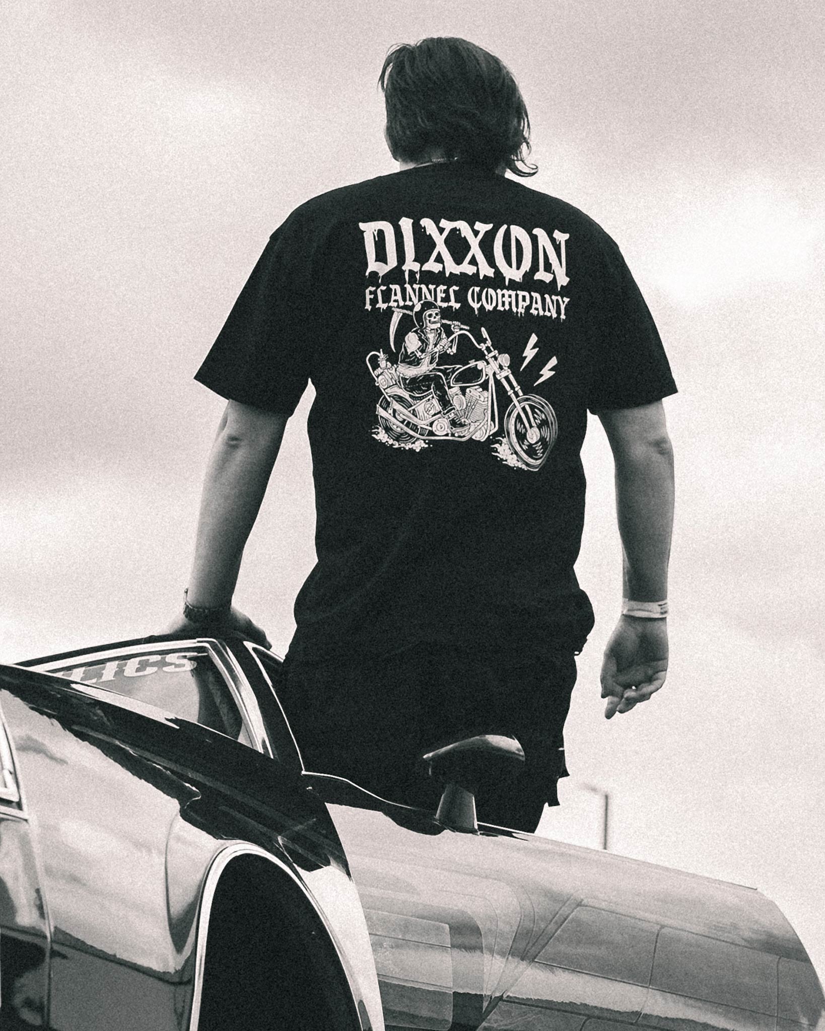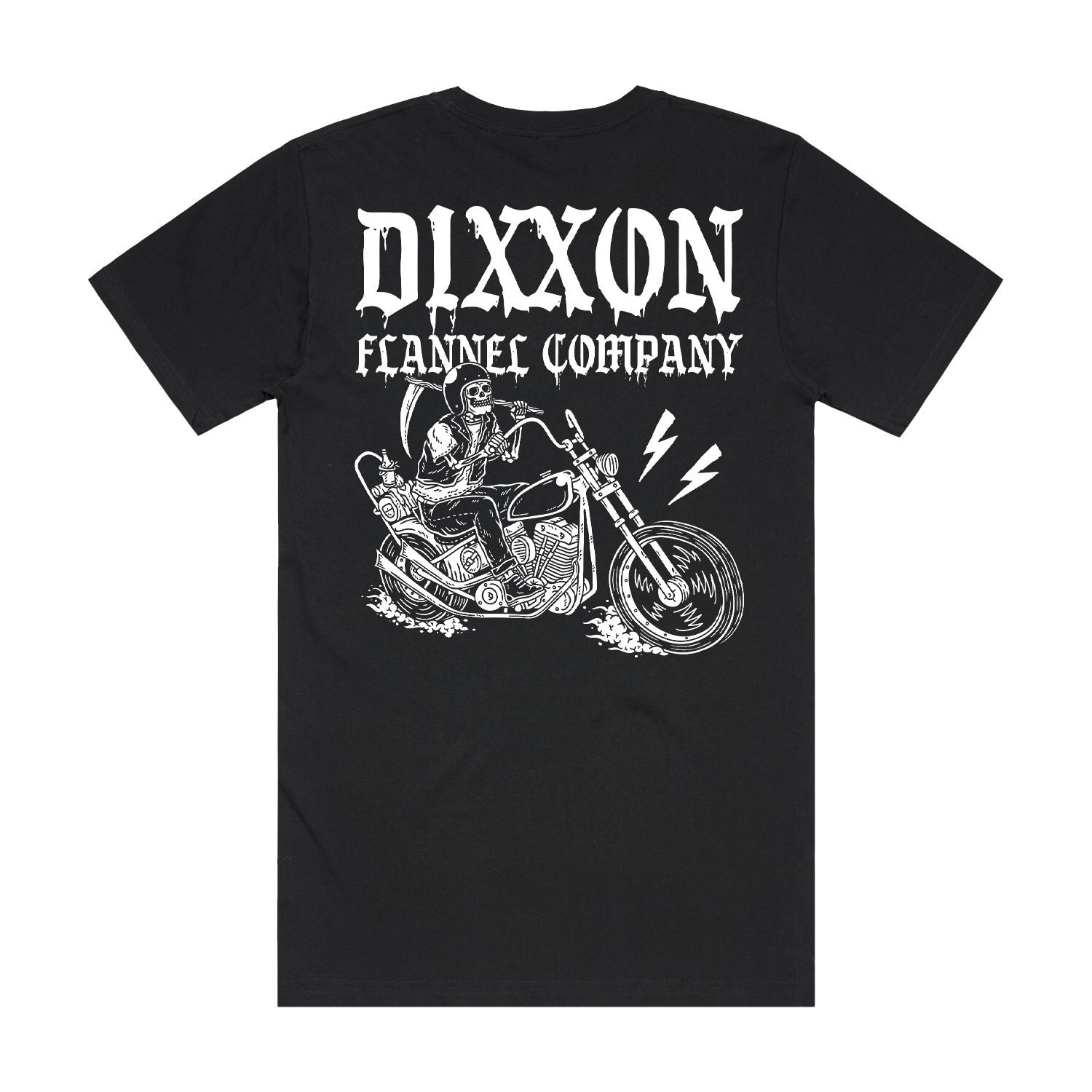 Add a dose of Dixxon to your daily wardrobe with the Men’s Death Rider T-Shirt. This cotton crew neck features a white "DIXXON FLANNEL COMPANY" print on the left chest and back.
