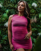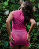 Serving looks from sand to street, the WomenÕs Mesh Cover Up Dress is your new go-to for bold, effortless layering. Styled in a fierce hot pink with a flattering, sleeveless tank cut, this semi-sheer piece was made to show off your suit underneath while keeping things light and breezy. With a body-hugging fit and a soft-stretch mesh, it's designed to keep up from poolside hangs to post-swim cocktails.