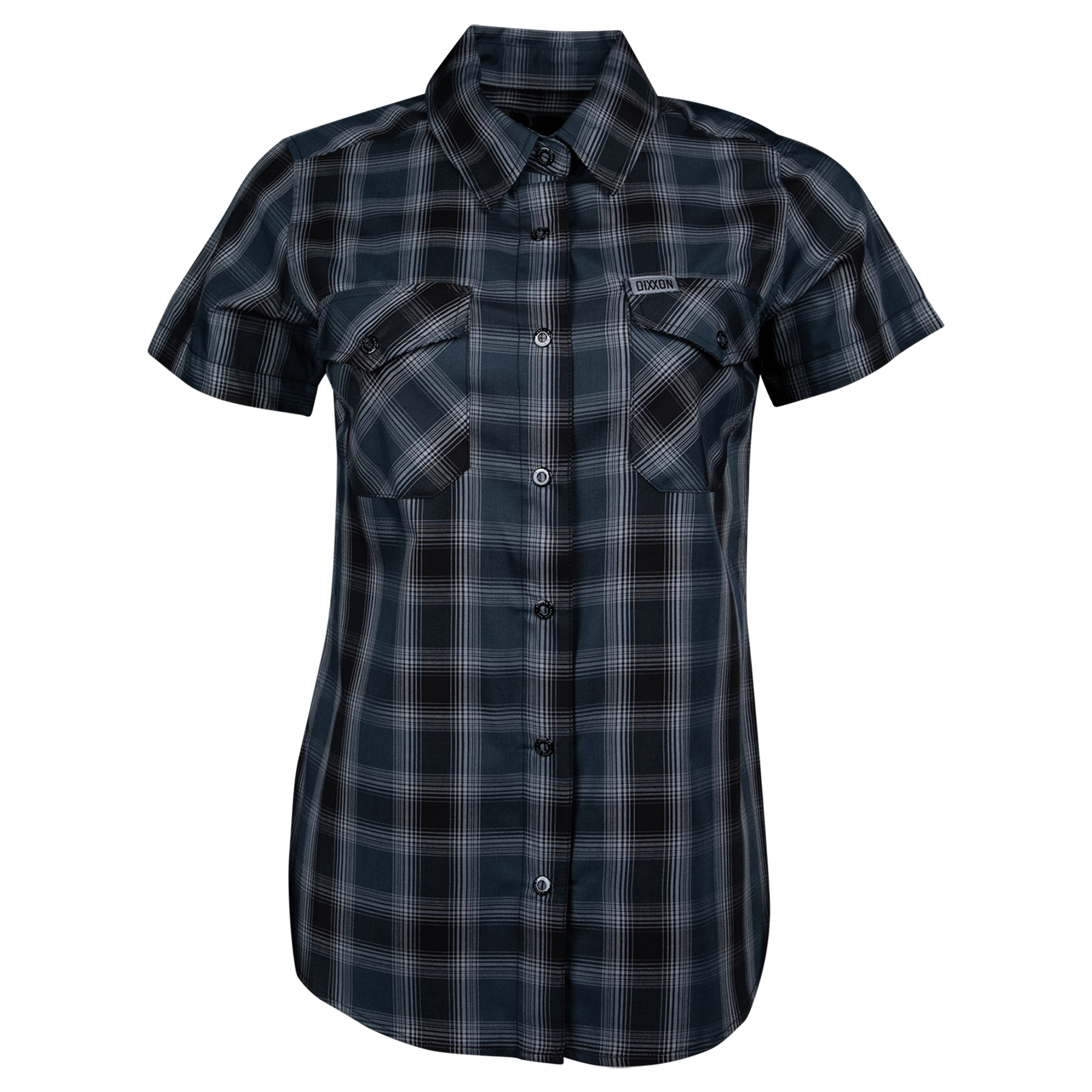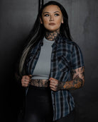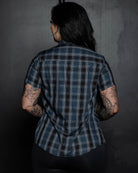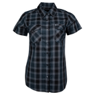 • Women's navy blue, black, and grey plaid patterned short sleeve bamboo shirt