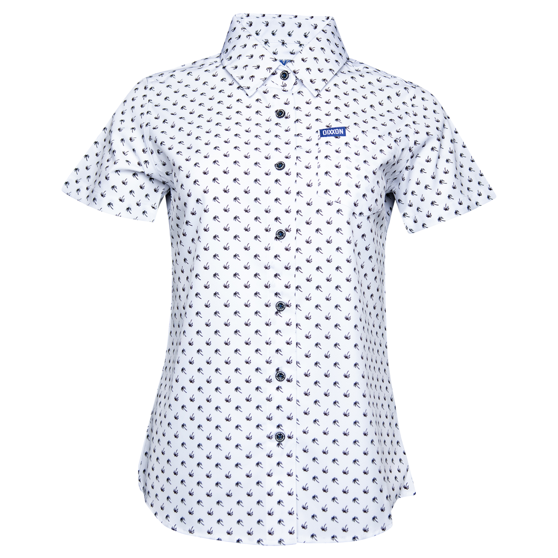Add some laid-back island vibes to an everyday essential with the Women's Royal Palms Party Shirt. Styled in crisp white with a micro palm tree pattern throughout, this short sleeve button-up delivers major beach club energy. Lightweight and breathable in our signature party blend, it's the shirt you'll reach for when the heat is high and the vibe is even higher.