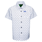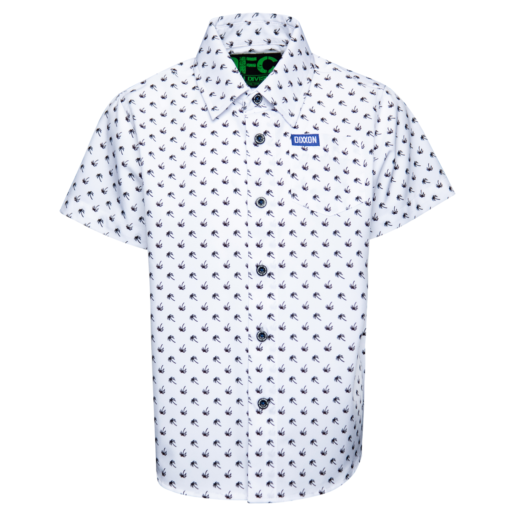 Add some laid-back island vibes to an everyday essential with the Youth Royal Palms Party Shirt for kids. This white short sleeve button-up is decked out in a mini palm tree pattern that's perfect for summer hangs, family beach trips, or just chillin' in style. Lightweight, stretchy, and built for movementâ it's tropical fun with a Dixxon twist.